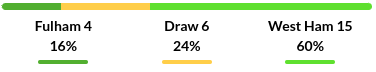 - In their last six league games, Fulham have won two, drawn one, and lost three, while West Ham have won two, drawn one, and lost three.