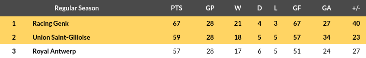 - Genk currently leads the league table with 67 points, eight points ahead of Union Saint-Gilloise after 28 matches.