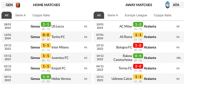 On Sunday evening, two Serie A teams, Genoa and Atalanta, meet in a clash between the 11th and fourth-placed sides, respectively, in the league standings.