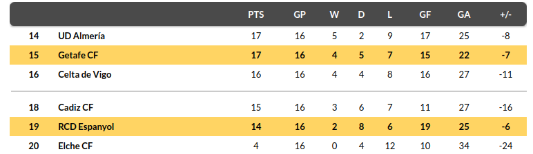 - Getafe is in 13th place with 17 points just two points above the drop zone.