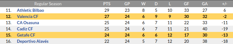 - The hosts are two points above the danger zone, and three behind Valencia after six wins from the 24 matches played thus far.