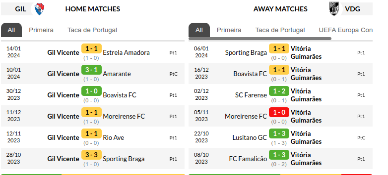 The previous encounter between these two clubs in the Primeira Liga saw Vitória SC emerge victorious with a 2-1 win at Estádio Dom Afonso Henriques in August. Tiago Silva and Nelson da Luz were on target for os Conquistadores, while Roko Baturina scored the lone goal for Gil Vicente.