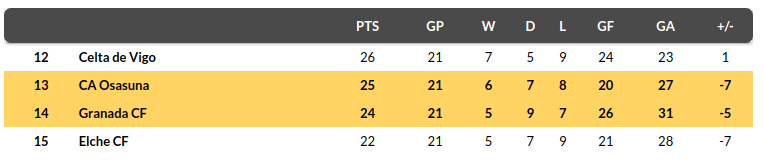 - The hosts are a point behind Osasuna and seven points above the bottom three.