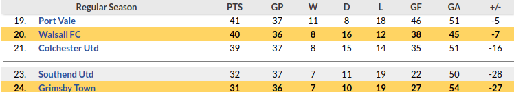 - Walsall are winless in their last 11 matches, in a period they have collected five points only.