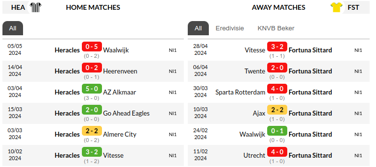 Fortuna Sittard comes into the match on a disappointing run of form, failing to win in their last seven games (three draws and four losses). This slump has left them positioned eleventh in the league table with 37 points. Offensively, they have managed 37 goals, but defensively, they have conceded a concerning 56 goals in 33 matches. Heracles, on the other hand, finds themselves in a relegation scrap, sitting just three points above the drop zone with one match remaining. Their situation is further complicated by a four-game losing streak, with their most recent defeat being a humiliating 4-0 loss to Excelsior.