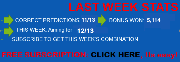 CONGRATULATIONS: WE WON A BONUS OF 5K FOR 11/13 CORRECT MIDWEEK JACKPOT PREDICTIONS LAST WEEK.OUR TARGET IS 12/13 THIS WEEK. WE ARE SURE OF 10 GAMES AND WILL USE DOUBLE CHANCES IN THE OTHER 3. CLICK HERE TO REGISTER
