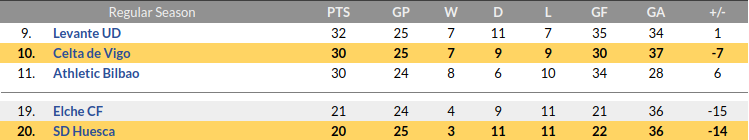 Huesca vs Celta Vigo Prediction: Standing