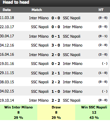 They have drawn twice in their last five meetings as Napoli won two games and Inter won one.
