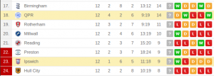 - They are at position 18th on the table with 14 points having won four games, drawn two and lost six.