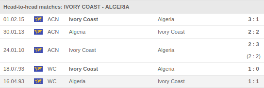 - The last time these two met was in 2015 and Ivory Coast won 3-1. It will be a heated match between these two and a draw should be expected.