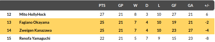 - The hosts are seven points clear of the relegation zone but tied on points with their opponents Okayama.