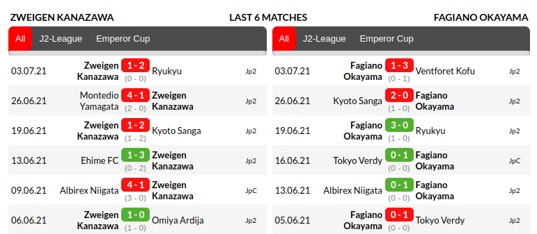 Kanazawa vs Okayama: Home/Away Matches