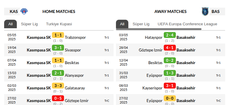 Kasimpasa vs Basaksehir : Standing