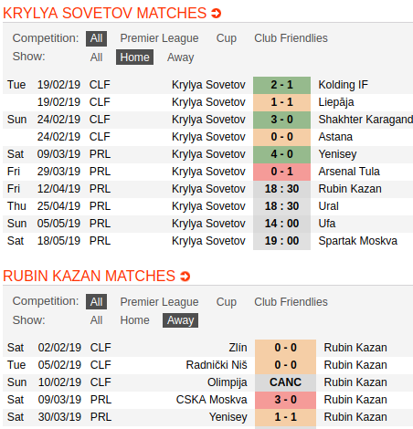 Kryliya Sovetov Vs Rubin Kazan Prediction: Home Away Matches