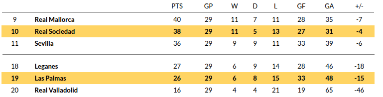 Sociedad’s 4-4 thriller against Real Madrid in the Copa del Rey may leave them fatigued, having kept just one clean sheet in 13 matches. While they’ve scored first in their last four meetings with Las Palmas, converting leads into wins has been an issue (only one victory in those games).