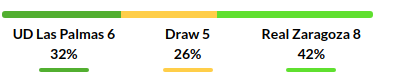 - Zaragoza have drawn their last three and with three wins across ten matches. The visitors are just three points above the bottom four and are in need of points. They have failed to impress on the road with just three wins from the 19 played.
