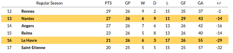 Nantes sit 13th with 27 points after their 1-0 win over Lille. Le Havre occupy 16th place with 21 points, just two from safety. The hosts currently sit in the relegation playoff spot.
