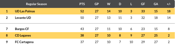 - Currently, in eighth place on 38 points, Leganés trail Albacete, who are in sixth place, by seven points for the last promotion play-off spot.
