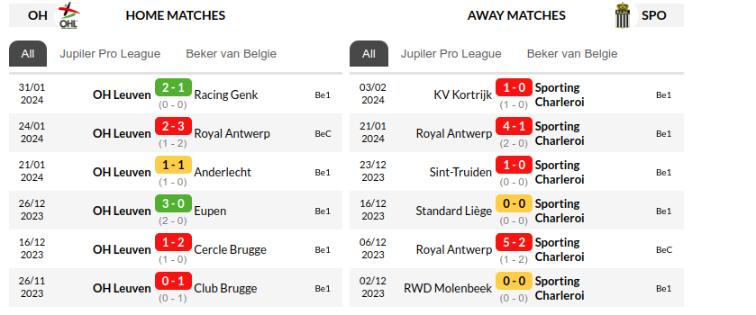 - OH Leuven favorites based on home form and historical dominance over Charleroi.