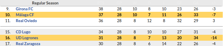 - Malaga have managed ten wins this season from the 28 matches played with seven draws and 11 defeats.
