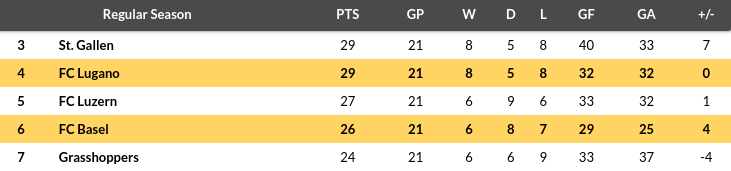 - On the other hand, Basel drew 2-2 against Servette in their last league game at St. Jakob-Park, placing sixth on the table with 26 points, three points behind Lugano for a place in the Conference League Qualifiers.