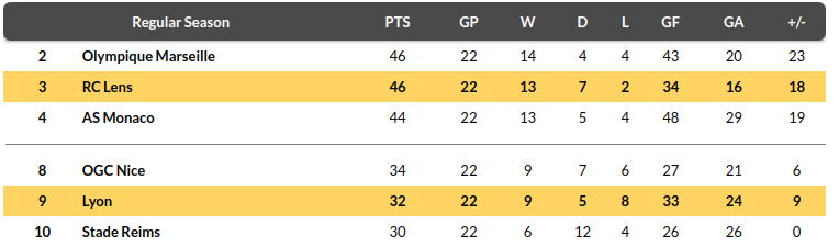 - Lyon, on the other hand, are in ninth place with 32 points, having scored 33 goals and conceded 24. With 16 matches remaining, they trail Rennes, who are in fifth place, by eight points for a spot in the Conference League Qualifiers. Lyon won their last Ligue 1 match against Troyes with a score of 3-1 at Stade de l’Aube, extending their unbeaten run to three (2 wins, 1 draw, 0 losses).