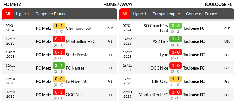 In their previous Ligue 1 meeting in October at Stadium de Toulouse, Toulouse secured a 3-0 victory over Metz.