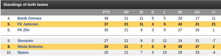 Mlada Boleslav Vs Baumit Jablonec Prediction: Standing