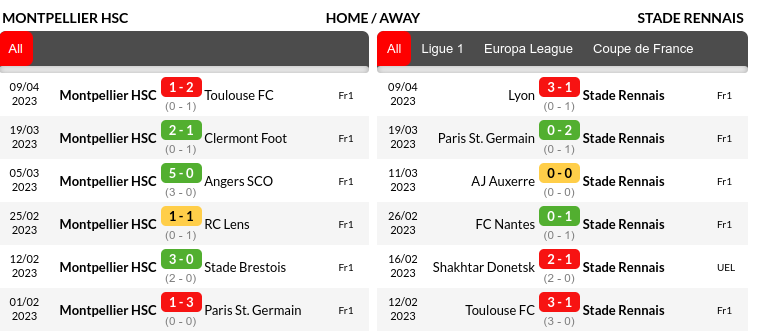 - Rennes won the last Ligue 1 meeting between the two teams, 3-0 at Roazhon Park in October. Rennes have won three straight clashes against Montpellier since November 2021.