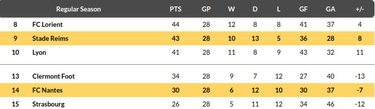 - With 10 matches left, they are in ninth place on 43 points, while Nantes are in 14th place on 30 points, 20 points away from the Conference League Qualifiers. Les Champenois trail Rennes, who sit in fifth place, by seven points.