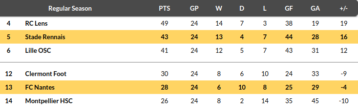 - Lille, who sit in sixth place, are just two points behind Rennes, while Nantes are in 13th place with 28 points, a distant 15 points away from a spot in the Conference League Qualifiers.