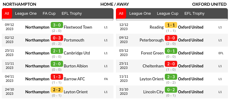 In their recent six league matches, Northampton has won four, drawn one, and lost one, while Oxford has secured two wins, two draws, and suffered two losses in the same period.