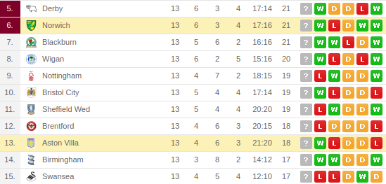 - They are at position six on the table with twenty one points having won six games, drawn three and lost four.