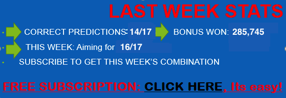 CONGRATULATIONS: WE WON A BONUS OF 55K FOR 10/13 CORRECT MIDWEEK JACKPOT PREDICTIONS LAST MINI JP. WIN A BONUS FOR 12/13. WE ARE SURE OF 11 GAMES AND WILL USE DOUBLE CHANCES IN THE OTHER 2. CLICK HERE TO REGISTER