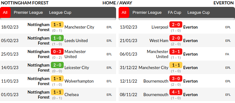 - In their last six league matches, Nottingham Forest have won two, drawn two, and lost two, while Everton have won two and lost four.