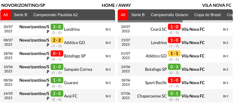 - As the hosts, Novorizontino has performed well at home this season, securing 17 points (W5 D2 L2) from nine Serie B contests at Estádio Heriberto Hülse. Meanwhile, Vila Nova has achieved four wins, two draws, and four losses in league matches away from Estádio Onésio Brasileiro Alvarenga this season. Currently, Vila Nova – GO is on a three-match away winless streak (W0 D1 L2), with their last away win being on June 24 against Botafogo SP.
