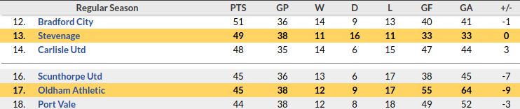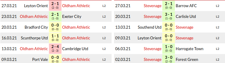 - Oldham (17th) take on Stevenage (13th) for the 39 round of the League two match.