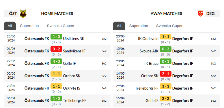 Östersunds FK have shown some resilience at home, securing victories in half of their matches. However, Degerfors IF boasts an impressive overall record with seven wins to their name. Historically, Östersunds FK has managed to hold Degerfors IF to draws in their previous encounters.