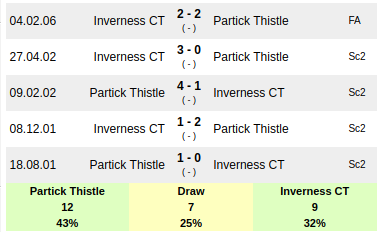 They have drawn twice in their last five meetings as Inverness won two games and Partick Thistle won one.