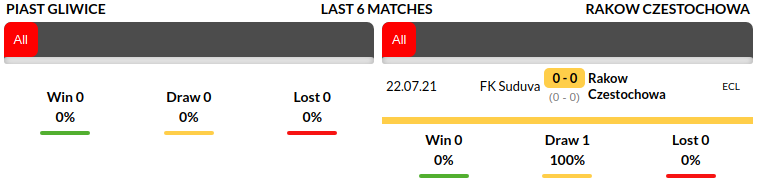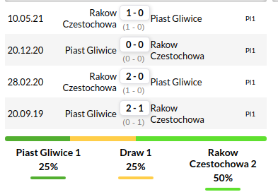 This two have played four times with Rakow winning two and Piast Gliwice managing just one.