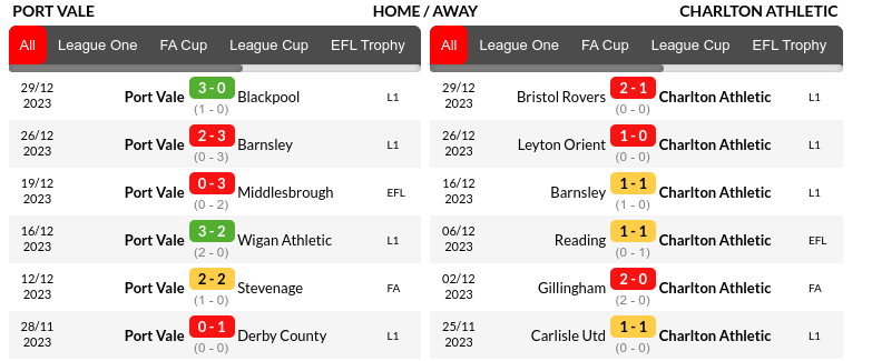 In their recent six league matches, Port Vale won three, drew one, and lost two, while Charlton drew three and lost three.