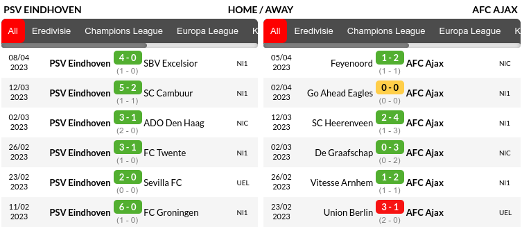 - At Philips Stadion, PSV have been formidable, winning 12, drawing 1, and losing just 1 of their 14 Eredivisie games this season. They will be looking to extend their 7-match unbeaten streak at home (W6, D1, L0) since January 7, when they host Sparta Rotterdam. Meanwhile, Ajax have earned 31 points in their 14 away league matches this season (W9, D4, L1) and are unbeaten in their last 10 away matches (W6, D4, L0) since their defeat against AZ in September 2022.