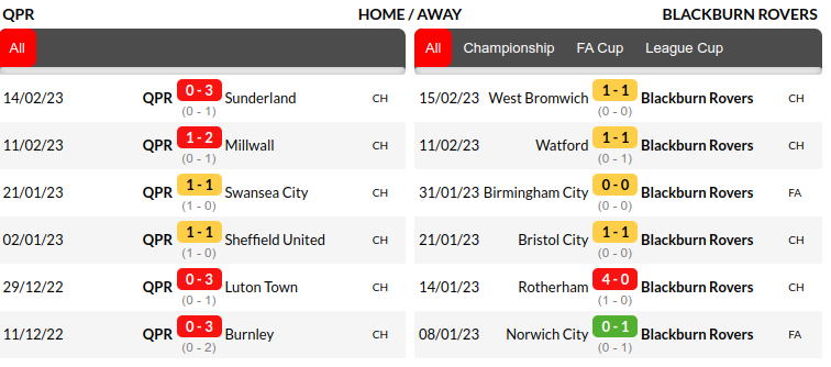 - In their last six league matches, QPR has drawn twice and lost four times, while Blackburn has won two and drawn four.