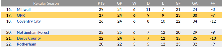 - The Rams who are two points above the relegation zone have managed just five wins from 24 matches and are five points behind QPR.