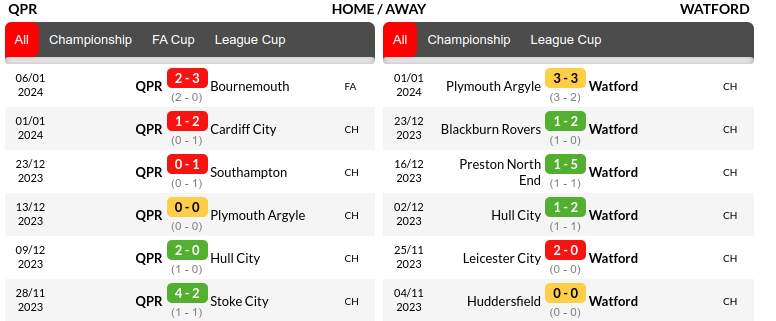 In their recent six league matches, QPR has drawn two and lost four, while Watford won two, drew two, and lost two.