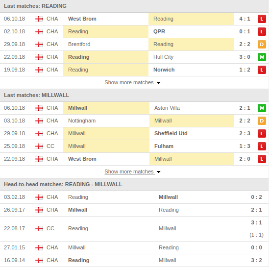 Reading vs Millwall Predictions & H2H: Standing