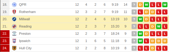 - They are at position 20 on the table with ten points having won two games, drawn four and lost six.