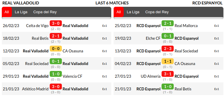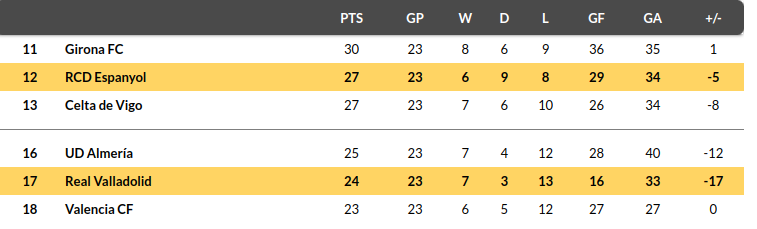 - However, they are only four points clear of the relegation places. In their last six league matches, Valladolid has won two, drawn one, and lost three, while Espanyol has won three, drawn one, and lost two.