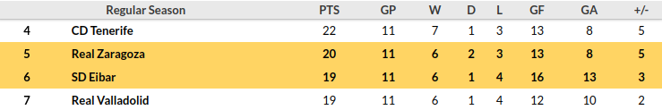 Real Zaragoza, in fifth place with 20 points, are three points behind Espanyol, the leaders, after 11 matches.