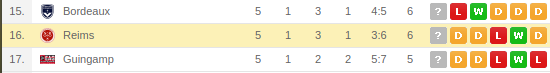 - The guests won during their last match played against Bordeaux. They are with one loss, one draw and three wins which kept a clean sheet in two of them in their last five games overall.